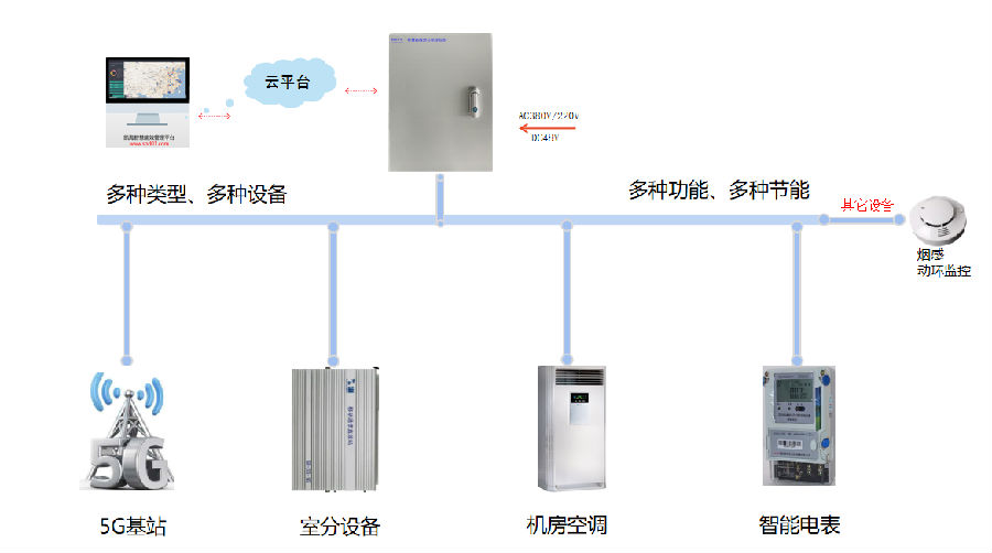 对于运营商通信基站智能用电节能控制,根据基站用电实时监管理、智能计量、采集负载单元的数据,在满足实时信号良性覆盖的同时,降低整网能耗,通过智慧能源综合管理系统平台设定基站主设备、室分设备、空调、动环监控等能耗制定一体化解决方案,应用本系统后可极大的降低基站能耗,降低 PUE值,实现5G机房应用低成本运营,降低碳排放水平。
