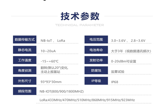 这款井盖监测相关设备,数据传输采用 NB - IoT、LoRa 方式,静态电流 10 - 20uA,工作温度在 - 15~+60℃,能检测翻转(默认 20°)变化并主动上报基站,外形尺寸为 939330mm,NB - IoT 频段涵盖 800/900/1800MHz,LoRa 频段包含 433MHz 等多个频段,电压范围有 3.0 - 3.6V、2.8 - 3.6V,电池寿命大于 3 年(视数据通讯频次),发射功率 0 - 20dBm 可设置,具备防腐蚀(盐雾试验)性能,IP 等级达 IP68。现场可安装井盖检测器,还能进行视频抓拍,适配多种管道井盖,为井盖监测提供有力技术与设备支持。